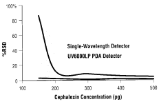 以上结果显示出,UV6000LP是如何通过增加灵敏度而降低Cephalexin的 LOD和LOQ值的。UV6000LP与可变波长检测器相比,由于性能的改进,使得其LOD值比原来降低了大约70%。此例也表明,检测和定量分析比以前含量更低的化合物已成为可能 。