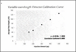 图2所示为试样从150pg到250pg范围内可变波长检测器的较正曲线。在试样浓度100pg时,其响应值是测不到的。较正曲线相关较正系数为0.9965。图3所示为同样样品浓度范围内UV6000LP的校正曲线。因为UV6000LP有较高的灵敏度,所以在样品浓度为100pg时有响应值。曲线在此点有响应值,并不影响相关系数,相关因子仍增到0.9992--这说明UV6000LP在低含量的精度有显著的改进。图4从另一角度来说明UV6000LP的特性。将两种检测器在不同浓度下的RSD值作图。可变波长检测器在150pg浓度时,RSD约为85%左右,这对检测工作无太大的意义。只有浓度提高到250pg,检测器的值才呈现出常数。然而,对于UV6000LP,在150pg即有响应值了。 此例说明了由于UV6000LP采用"光导管"技术,从而在低样品含量检测时,大大改进其数据的定量精度。表2总结了在不同水平的%RSD数据。