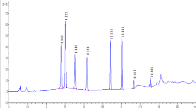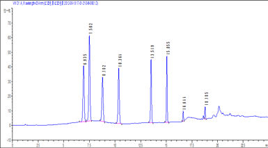 取试样(某品牌红酒)20mL,加入合成着色剂混标溶液1.0mL,混匀,用10%氨水调节PH约6.0,将全部试样经过Cleanert® JXA柱,分别用水(PH=4.0)、甲醇/加酸(6+4)溶液6ml淋洗,再用10mL水淋洗,用乙醇-氨水溶液-水(7+2+1)6mL洗脱,收集洗脱液于50℃水浴蒸发至干,加水定容至1.0mL,经0.45μm滤膜过滤,待测。