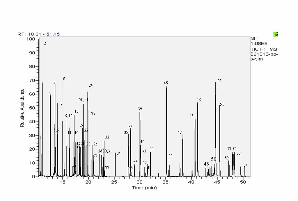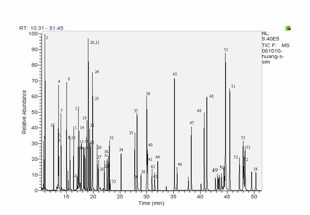 柱温箱升温程序:50℃(保持2min)以10℃/min升温至180℃ (保持1min)再以3℃/min升温至250℃(保持1min),再以2℃/min升温至270℃(保持15min);